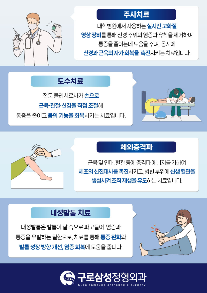 근골격계 통증은 신체의 구조적, 기능적 변화에서 시작됩니다. 통증을 일으키는 원인을 정형외과 전문의가 정확하게 찾아 증상 개선과 함께 건강한 생활을 찾아드립니다.